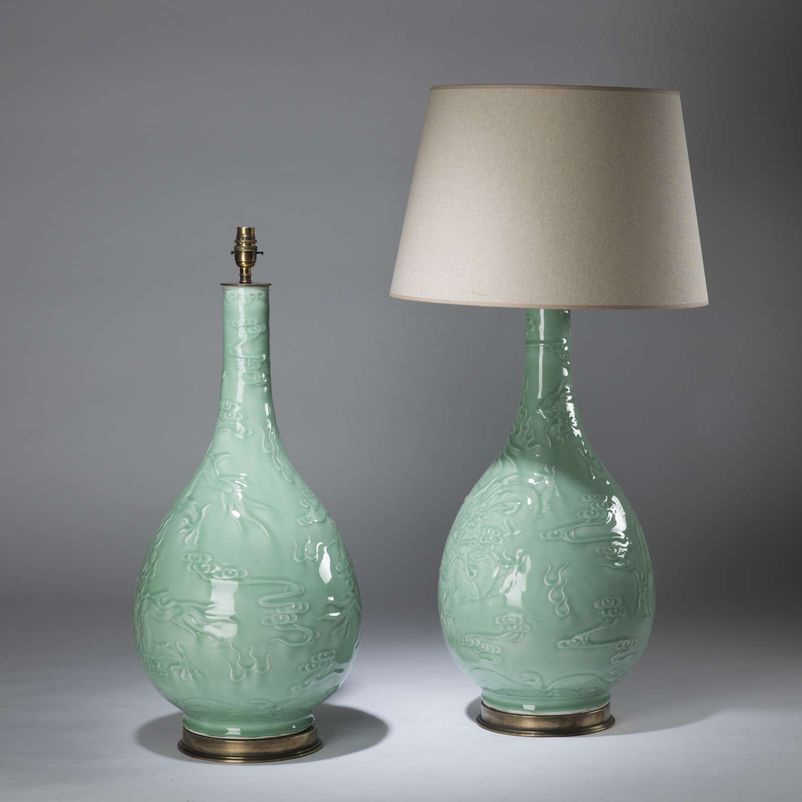 Pair Of Huge Green Ceramic 'dragon' Teardrop Lamps On Round Brass Bases