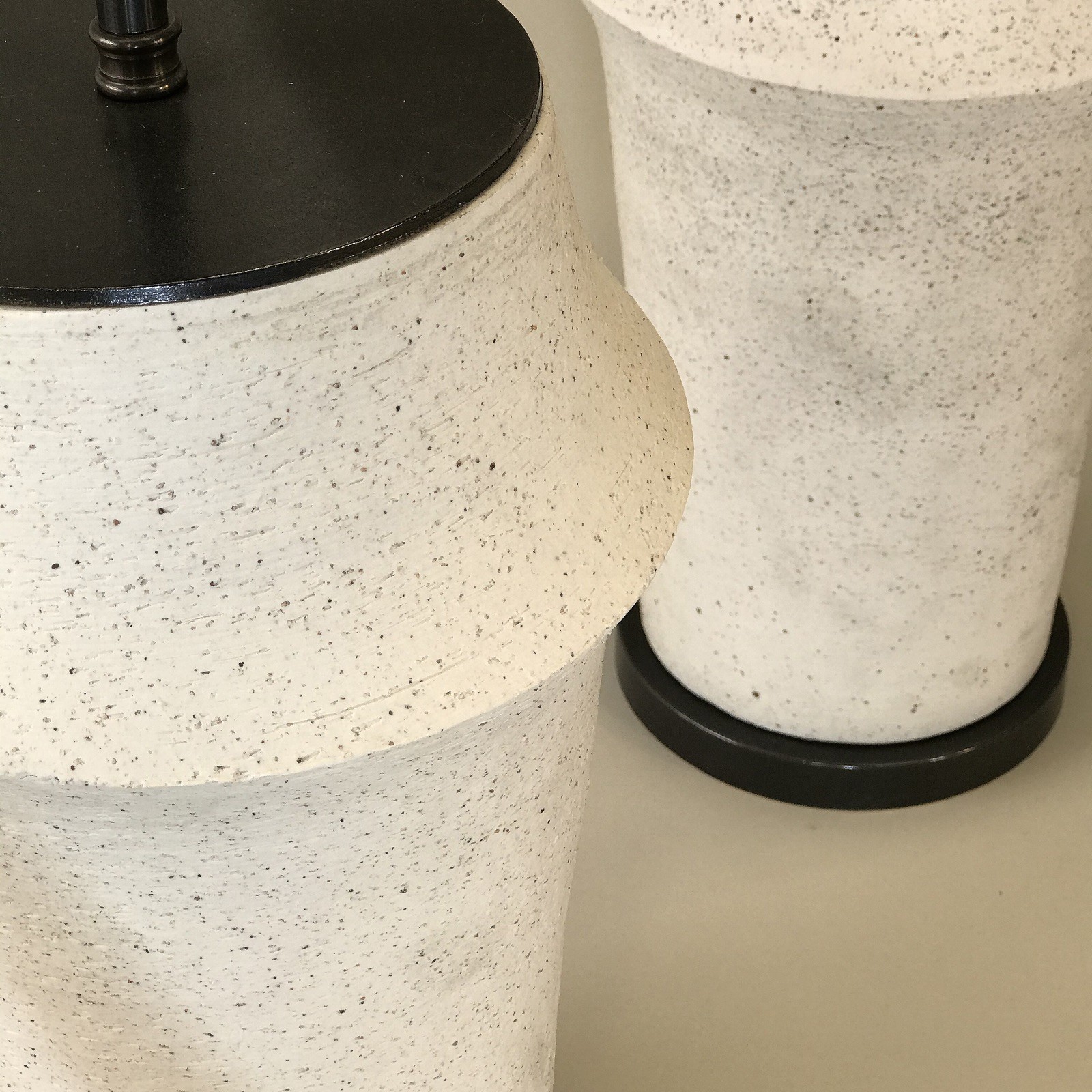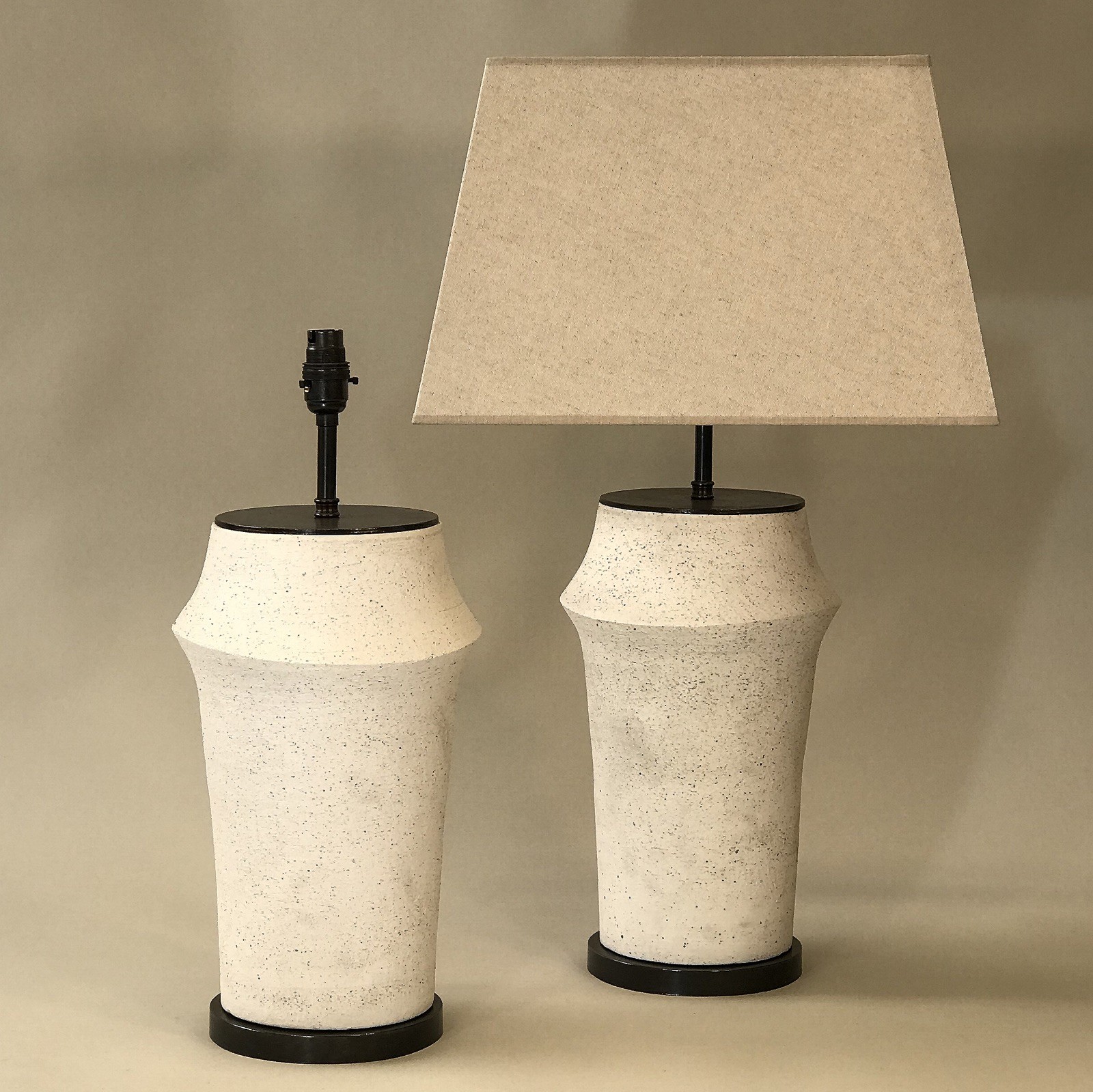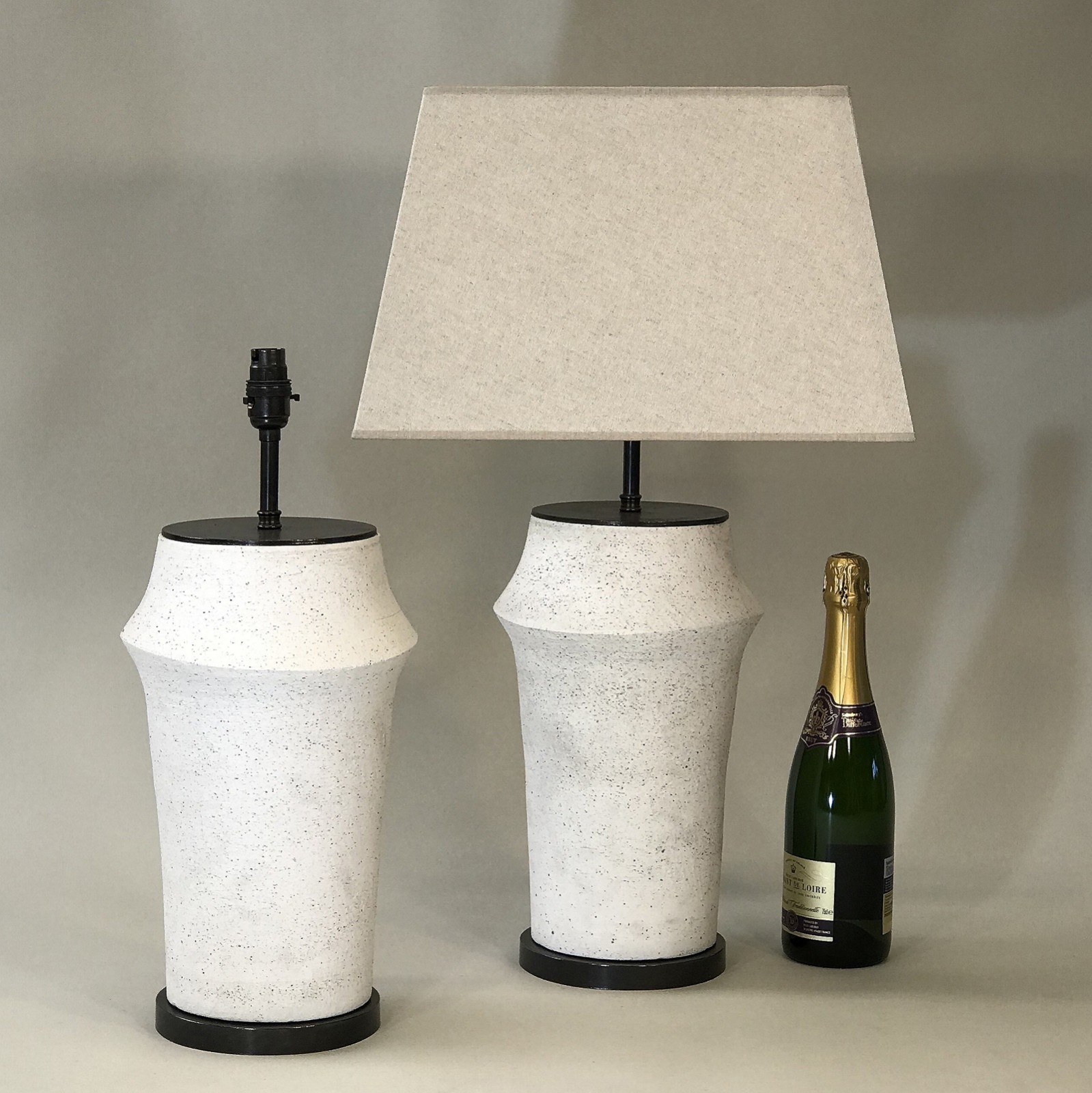 Pair Of Medium White Ceramic Ridged Mid Century Style Lamps On Brown Bronze Bases