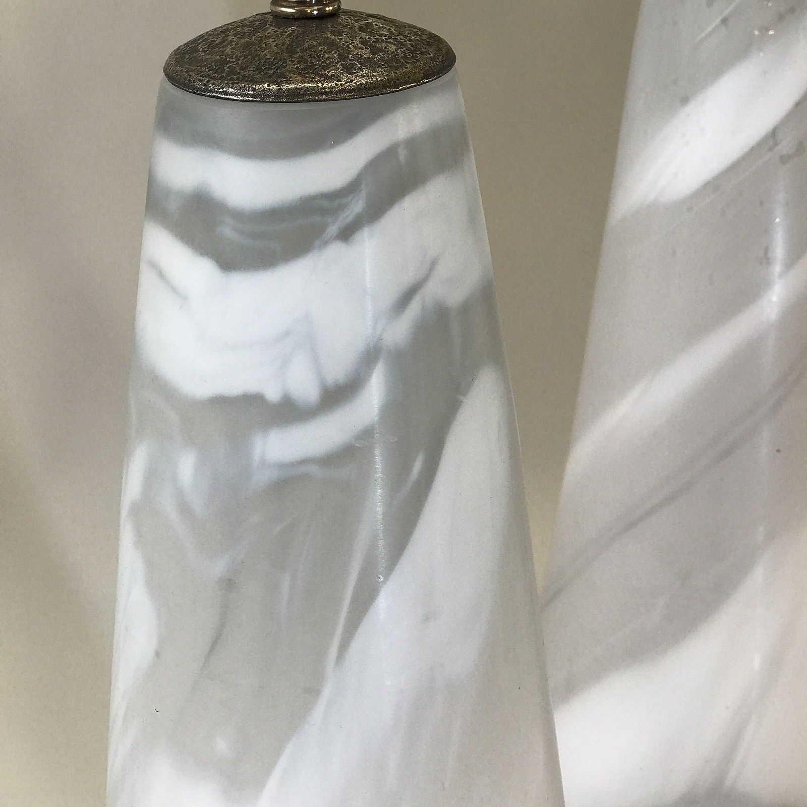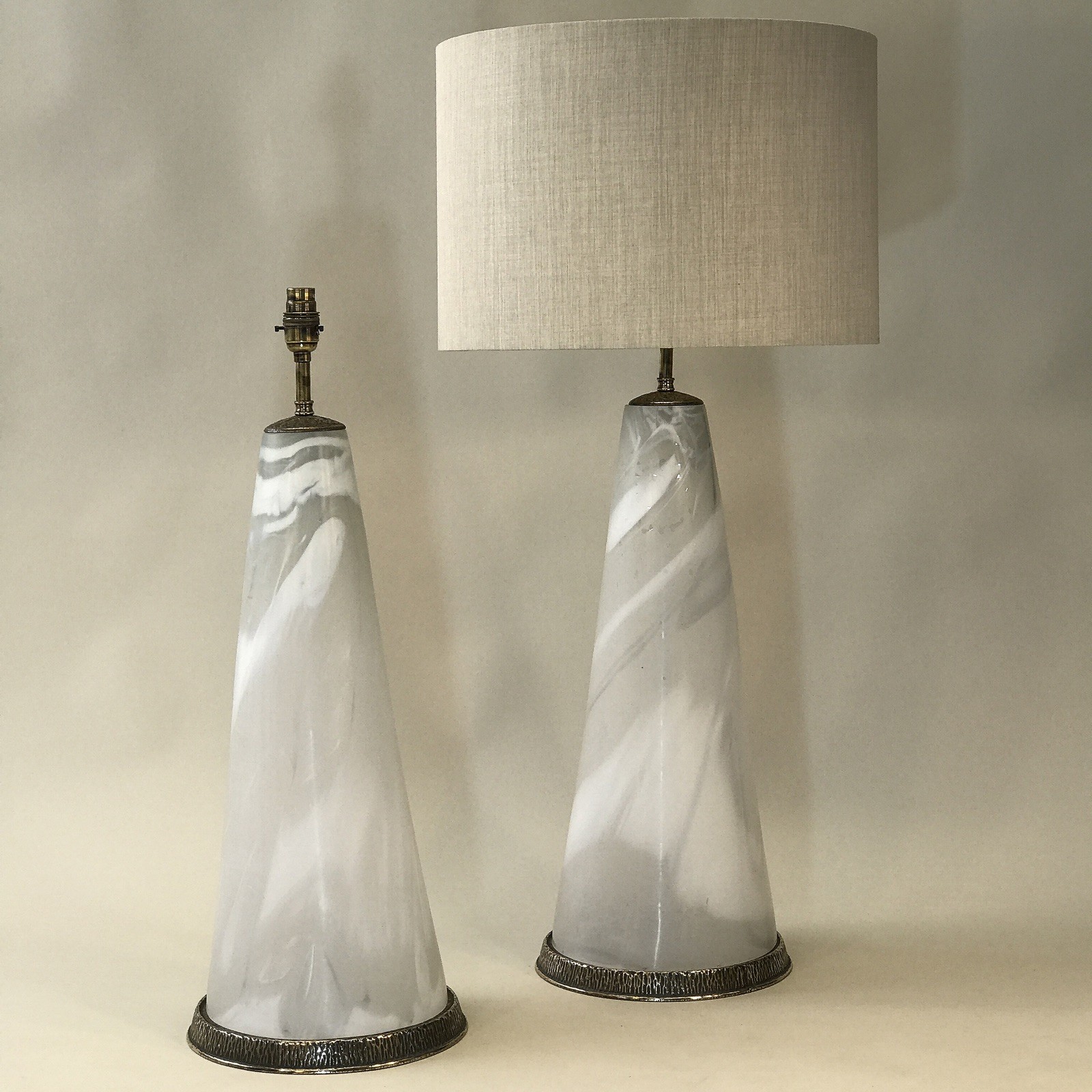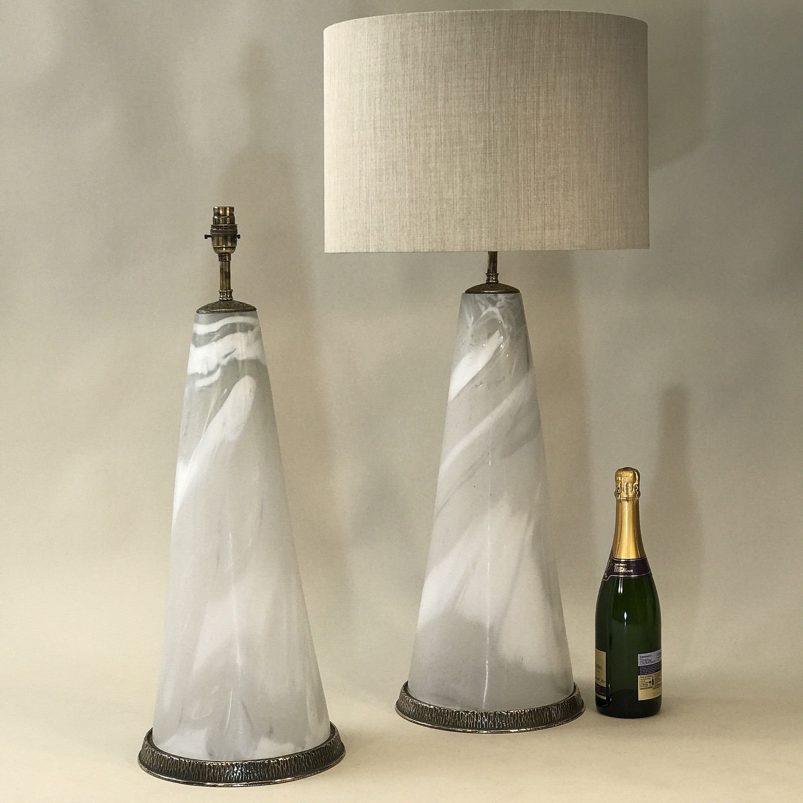 Pair Of Large Glass 'warm Alabaster Effect' Cone Lamps On Textured Antique Brass Bases